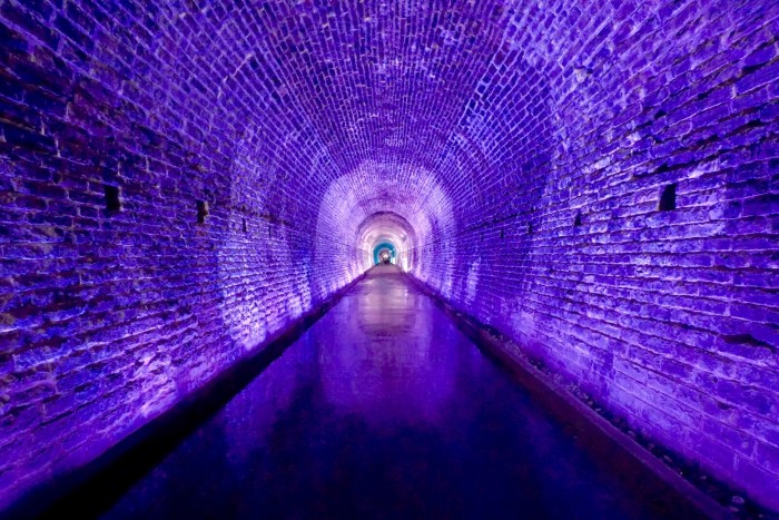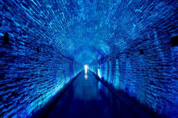 Ist der Tunnel immer so einzigartig beleuchtet und beschallt? Oder nur zur vollen Stunde? Also rund um die Uhr? Ist ja fantastisch. Ein tolles Farb- und Klangerlebnis.