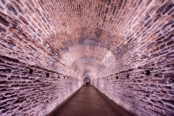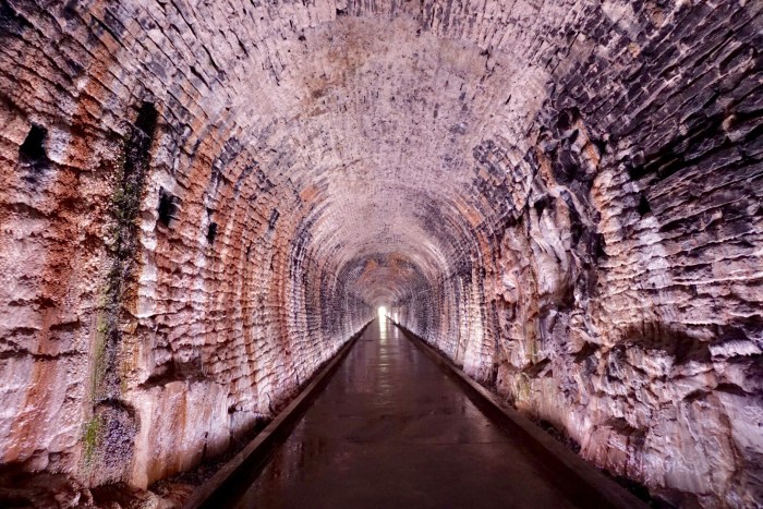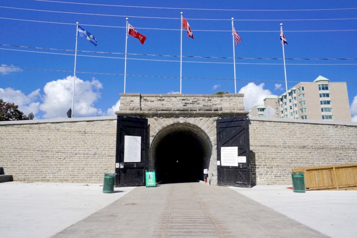 Doch das Beste kommt zum Schluss. Der eigentliche Grund, weswegen wir hier einen Stopp eingelegt haben, ist der Brockville Railway Tunnel! Das 500 Meter lange Bauwerk war als Kanadas erster Bahntunnel von 1860 bis in die 1970er Jahre in Betrieb. Dann lag er brach. 2016 schließlich begannen Restaurierungsarbeiten, um den Tunnel in einen bestehenden Walk- and Bike-Trail einzubeziehen. Seit kurzem ist er nun für die Öffentlichkeit zugänglich.