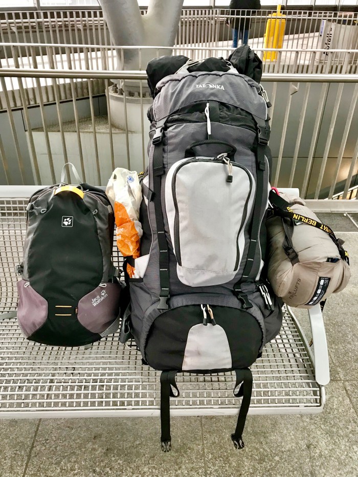 Das Packen gestaltet sich dieses Mal für meine minimalistischen Verhältnisse recht komplex. Dank des umfangreichen Equipments, das die Tour durch die Wüste erfordert (siehe heutiges Titelbild), lande ich bei sagenhaften 18 Kilo. Dazu gesellt sich der kleine Rucksack als Handgepäck, der mit weiteren 6 Kilo zu Buche schlägt. Diese 24 Kilo gilt es bis zum Abflug irgendwie zu bewältigen, bevor ein Großteil davon im üppigen Bauch des Fliegers verschwindet.