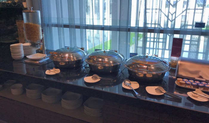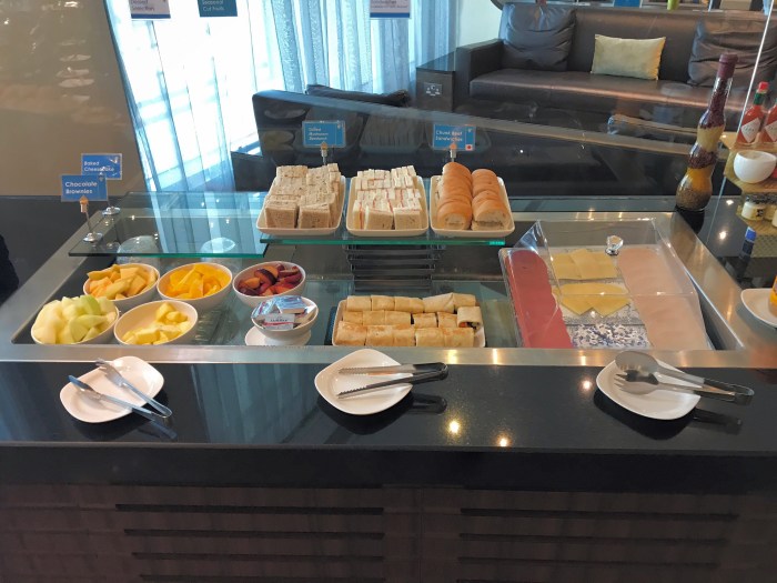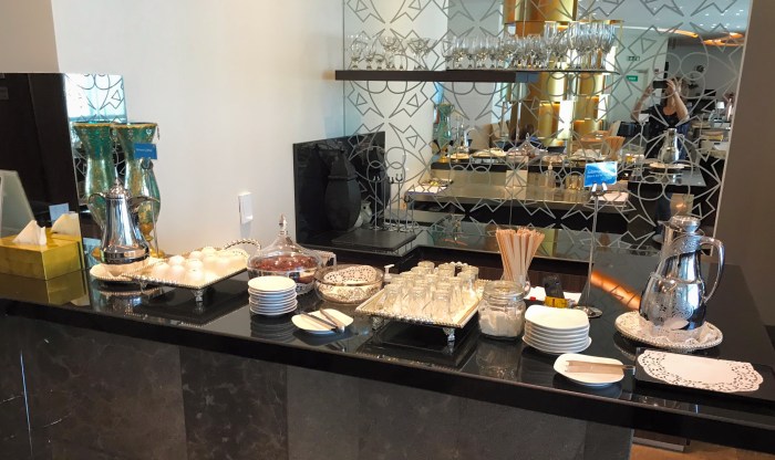 Ankunft am Flughafen ohne weitere Vorkommnisse. Das Gepäck sind wir schnell los. Auch die Sicherheitskontrolle bringen wir flott hinter uns. Und so bleibt uns viel Zeit für das Highlight des Morgens. Maria hat Zugang zur Business Lounge von Oman Air und darf einen Gast mitbringen: mich. Herzlichen Dank noch einmal an dieser Stelle! Das Frühstück hier ist um etliche Klassen besser als im Hotel. Und so lassen wir es uns kulinarisch und atmosphärisch gut gehen. Gebt es ruhig zu: da hättet ihr doch auch gerne eine Runde mitgefuttert, oder?