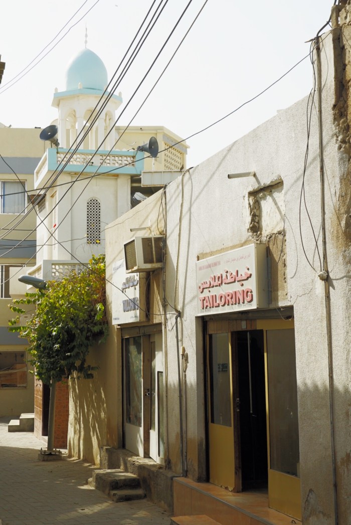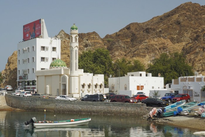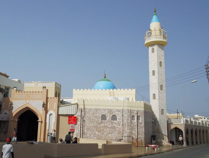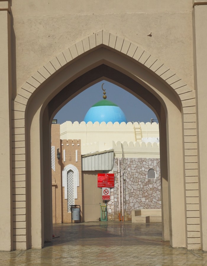 Durch die Wanderwoche in der Wüste ans zeitige Aufstehen gewöhnt, stehe ich dann nach etwa 15 Minuten Taxifahrt schon um 8:30 morgens startklar an der Corniche von Mutrah. Dort geht um diese Uhrzeit, äh, noch nicht allzu viel bis gar nichts. Schleiche ich eben ein wenig durch die Gassen der Umgebung und bewundere herrschaftliche Häuschen, ansehnliche Moscheen und sonstige Kuriositäten am Straßenrand.