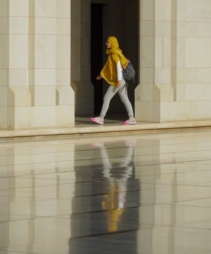 Mustergültig früh am Start, betrete ich das Gelände als eine der ersten zusammen mit Kristin aus Luzern, die ich bei der Suche nach dem richtigen Eingang kurz vorher getroffen habe. Fix Kopf und Arme bedeckt, und schon bin ich ohne Sicherheitskontrolle (da war Abu Dhabi doch ein ganz anderes Kaliber!) drin. Bei Kristin dauert es indes etwas länger, weil der „Einlasskontrolleur“ nicht mitansehen kann, wie sie versucht, ihr Tuch mehr schlecht als recht über dem Kopf zu drapieren. Da greift er beherzt zu und macht es lieber selber. Kommt mir irgendwie bekannt vor 😅!