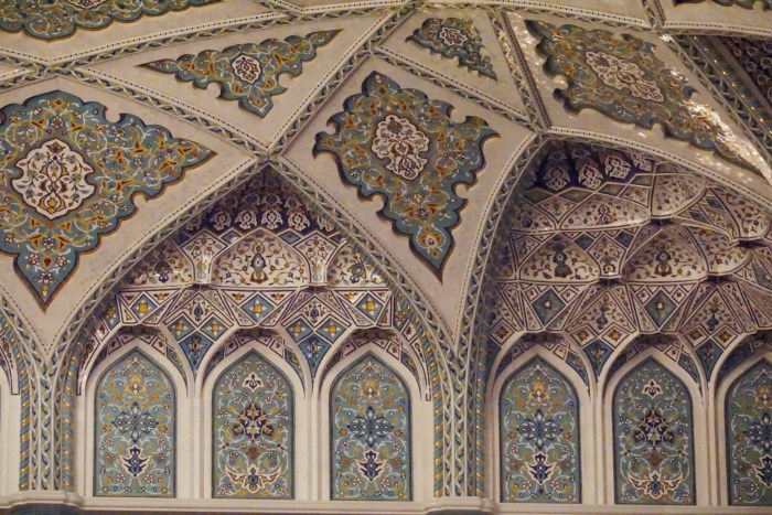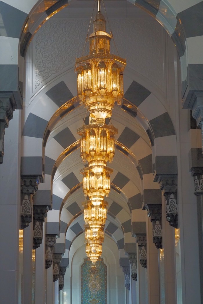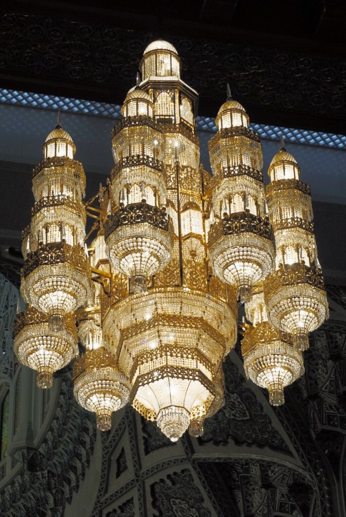 Und auch innen kann sie sich sehen lassen! In der Großen Gebetshalle hängt ein 14 Meter hoher Kronleuchter mit Swarovski-Kristallen und 1.122 Glühbirnen über einem der größten Perserteppiche der Welt.