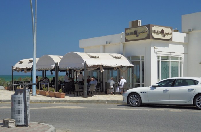Ich versuche mein eher unwahrscheinliches Glück mit der privaten Villa des Herrschers von Katar und siehe da: die kennt mein Fahrer! Und das, obwohl mir im Eifer des Gefechts das englische Wort für Herrscher nicht einfällt und ich stattdessen was von „this guy from Katar“ murmele 😅. Der Einfachheit halber steige ich dann auch gleich vor der Villa aus und laufe die restlichen paar Meter zu Fuß bis zu meiner Unterkunft. Geht schneller, als dem Fahrer zu erklären, dass ich kein Foto von der Hütte machen und dann wieder einsteigen will, um ihn dann noch umständlich 150 Meter weiter bis zum Hotel zu lotsen. Taxifahrer im Orient – immer für eine Story gut!