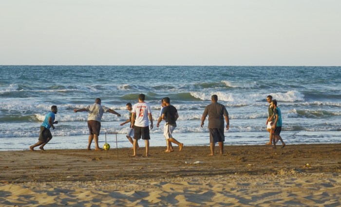 Am späten Nachmittag ein letztes Mal zum Strand. Dort genieße ich die relaxte Stimmung und betrachte die picknickenden und flanierenden Familien und Frauengruppen, die Food Trucks und auch die Fußballspieler. Auch die Villa „des Typen aus Katar“ schaue ich mir noch einmal an, dieses Mal von der anderen Seite.