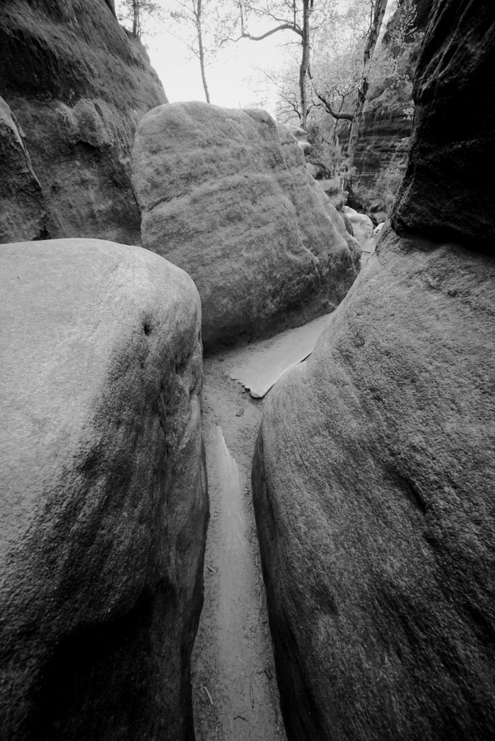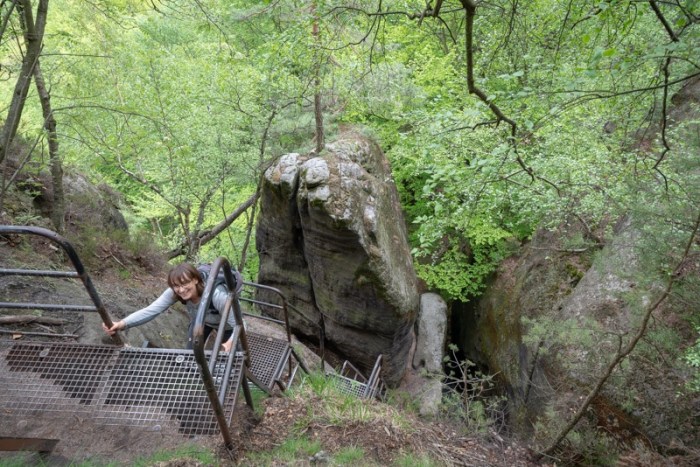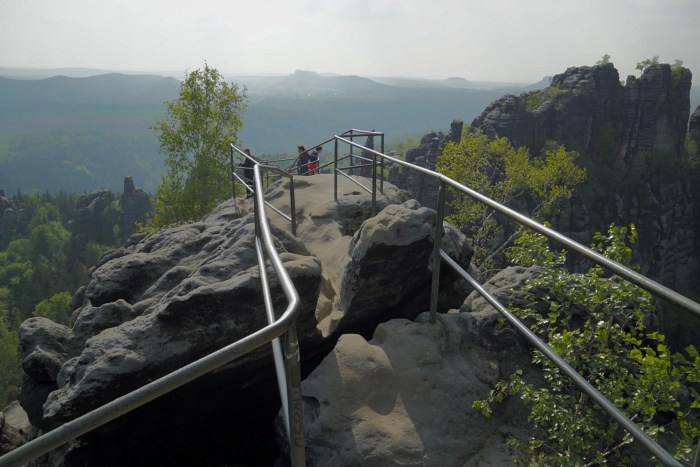 Der Weg vom Tal hoch zur Aussichtsplattform namens „Schrammsteinaussicht“ ist mit wenigen Kilometern zwar nicht sonderlich lang, hat es jedoch in sich, was die Steigungen betrifft. Gekraxel über dicke Felsbrocken inklusive. Insbesondere auf der Schlussetappe sind bis zu 20% Steigungen zu überwinden, was nur noch mit Leitern zu bewältigen ist.