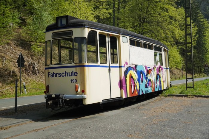Kurzer Boxenstopp im Supermarkt und in der Wohnung, und weiter geht’s. Nur keine Müdigkeit aufkommen lassen! Fußläufig zur Wohnung liegt die Starthaltestelle der nostalgischen Kirnitzschtalbahn. Und von dieser lassen wir uns in aller Gemächlichkeit durch die wunderschöne Landschaft des gleichnamigen Tales bis zur acht Kilometer entfernten Endhaltestelle kutschieren. Das olle Teil braucht für die kurze Strecke sagenhafte 25 Minuten. Doch es gibt viel zu sehen am Wegesrand.