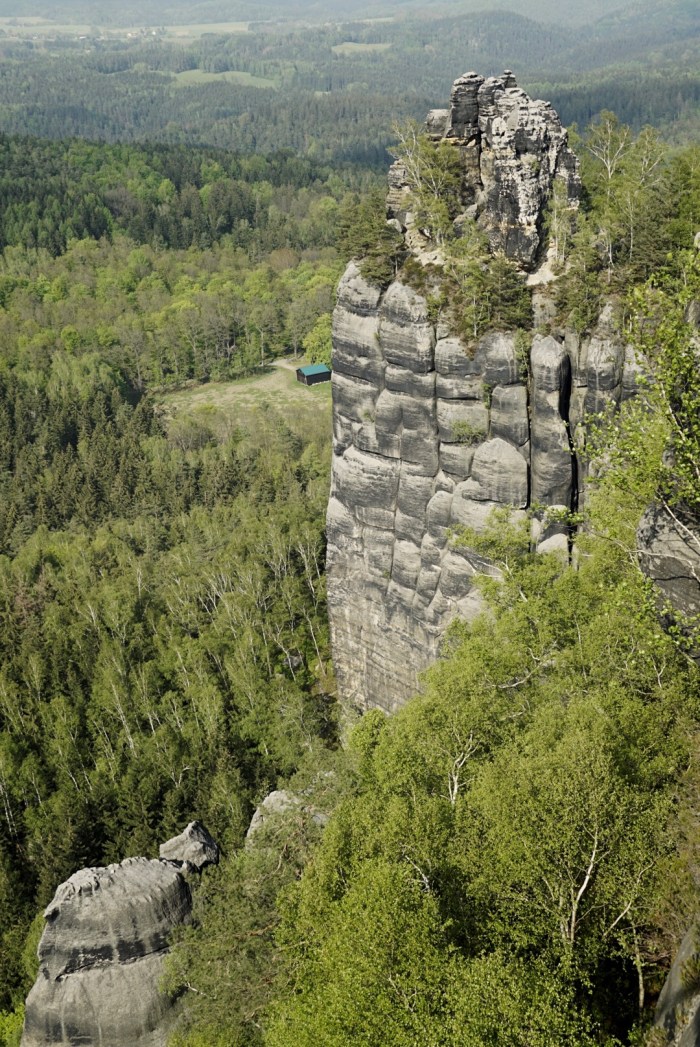 Doch der Weg ist wunderschön, und die Mühe lohnt sich. Auf 417 Metern über NHN bietet die Aussichtsplattform eine grandiose Sicht auf die Schramm- und Affensteine, auf das Elbtal und den gesamten östlichen Teil der Sächsischen Schweiz. Beim Hin- und Herlaufen auf der Plattform vermeide ich es bisweilen, auf den Boden zu sehen, denn der Weg führt über so manchen Felsspalt 😅.