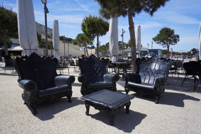 Im Vorbeilaufen amüsiere ich mich über diese opulenten Sitzmöbel, …