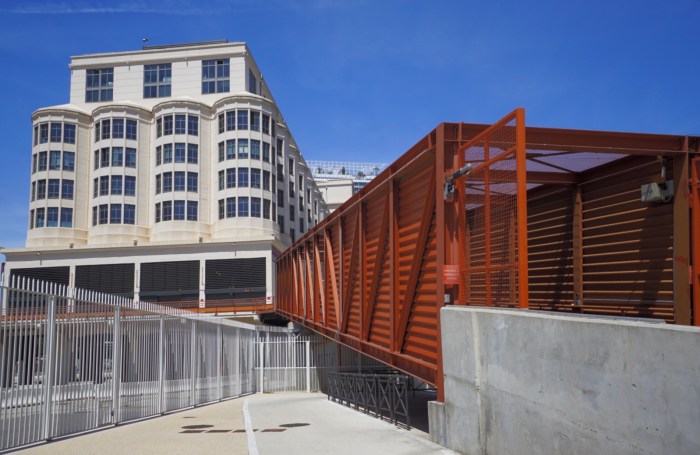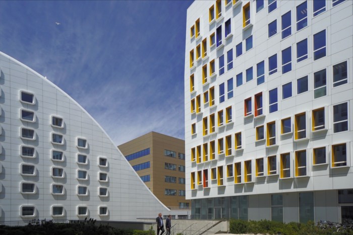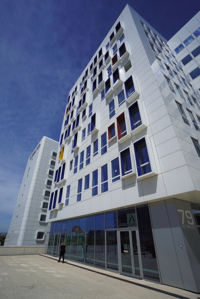 Direkt gegenüber auf der anderen Straßenseite steht ein fast 100 Jahre altes Ensemble aus ehemaligen Getreidesilos im Art-Déco-Stil. Was tun mit diesen zum Teil fensterlosen, runden Dingern, wenn der Denkmalschutz ein strenges Auge auf die Umgestaltung wirft? Nun, für Wohnungen und Büros kam der geschlossene Teil des Gebäudes jedenfalls nicht in Frage. Hat man eben einen Konzertsaal mit 2.200 Sitzplätzen daraus gemacht! Der andere Teil (siehe Fotos) wurde in Büroräume umgewandelt und der Zugang über eine originelle Rampe gewährleistet.