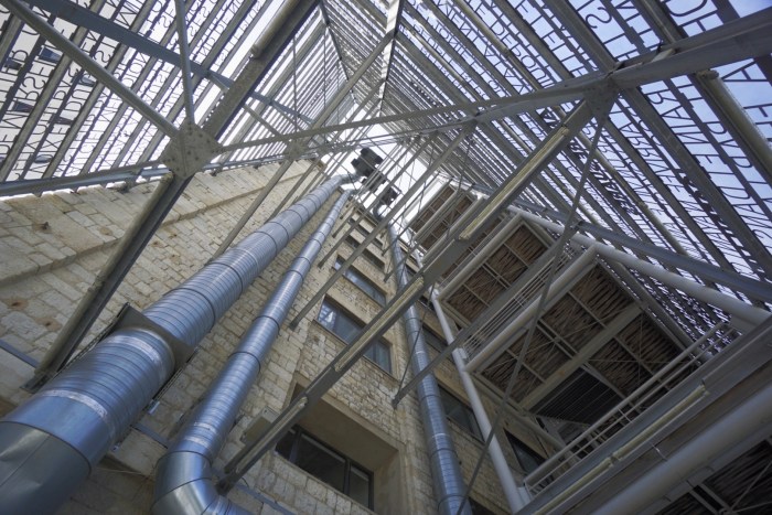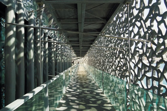 Nach Museumsbesuch ist mir heute nach der Vielzahl an neuen Eindrücken nicht mehr. Doch zum Glück steht ein Teil des Hauses auch der Nicht-Besucherin offen, nämlich das Treppenhaus und die Gänge, die das Gebäude umwickeln und zur sogenannten Passerelle, dem Übergangssteg zum gegenüberliegenden Fort St.-Jean führen.