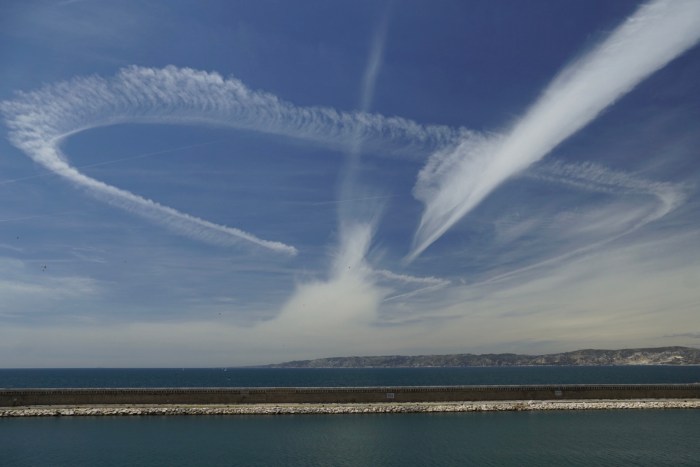 Ich gönne mir ein Eis, lasse mich auf einer der Bänke nieder, recke mein Gesicht der Sonne entgegen und betrachte die Kunstwerke aus Kondensstreifen, die diverse Flugzeuge hinterlassen haben und den eh schon mit Wölkchen angereicherten Himmel weiter marmorieren.