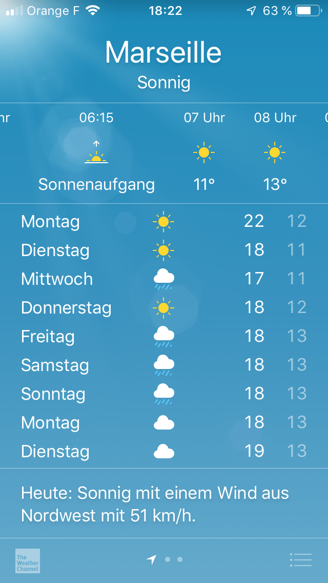 Ich hatte schon so manches über den Mistral gehört. Und insgeheim dachte ich mir meist: „Was machen die nur immer so ein Drama um ein laues Lüftchen!“ Heute jedoch habe ich es verstanden. Ein komplett wolkenloser Himmel, eine mehr als ordentliche Brise, gepaart mit akutem Temperatursturz: Vorhang auf für den gefürchtetsten aller Mittelmeerwinde! Beachtet bitte die Windgeschwindigkeit in der letzten Zeile 😅.