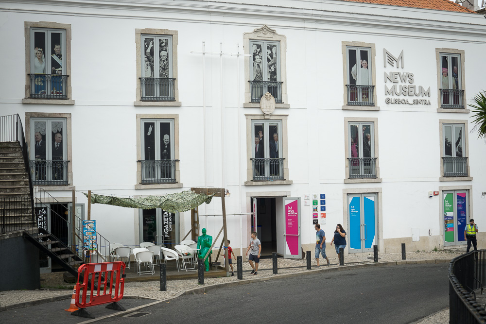 Nun aber los! Kaum raus aus dem Hotel, sehen wir uns zu einem ersten Stopp gezwungen. Bekannte Persönlichkeiten bevölkern die Fenster des benachbarten Gebäudes, vor dem ein imposanter Kerl in der Farbe der Hoffnung Platz genommen hat. Hier hat das News Museum eine Heimat gefunden.