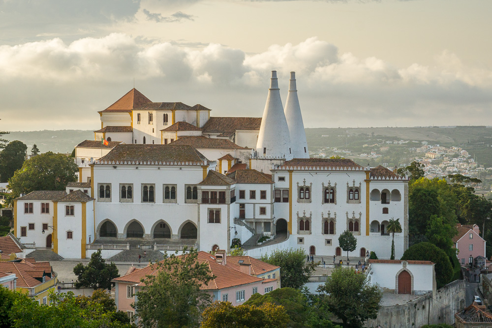 Der Palast ist der einzige vollständig erhaltene mittelalterliche Herrscherpalast Portugals. Auf den Fundamenten einer maurischen Wohnanlage aus dem 10. Jahrhundert errichtet, bekam er bis ins 19. Jahrhundert diverse Anbauten in verschiedenen Baustilen verpasst. Dennoch – oder gerade deshalb – ist er eine Augenweide. Hier eine Aufnahme vom späteren Nachmittag „von oben herab“: