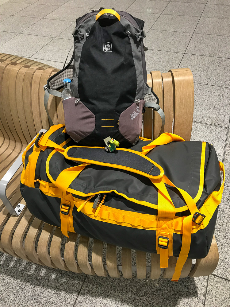 … bis der Check In öffnet. Gepäck, Alter Sack und Elke sind bereit zum Abflug!