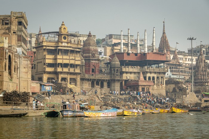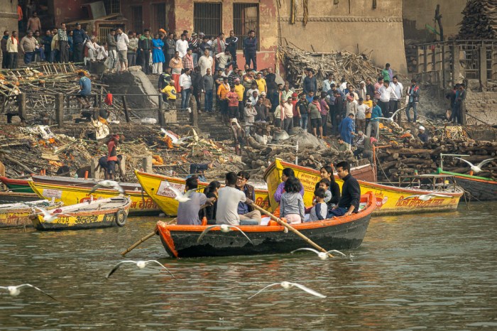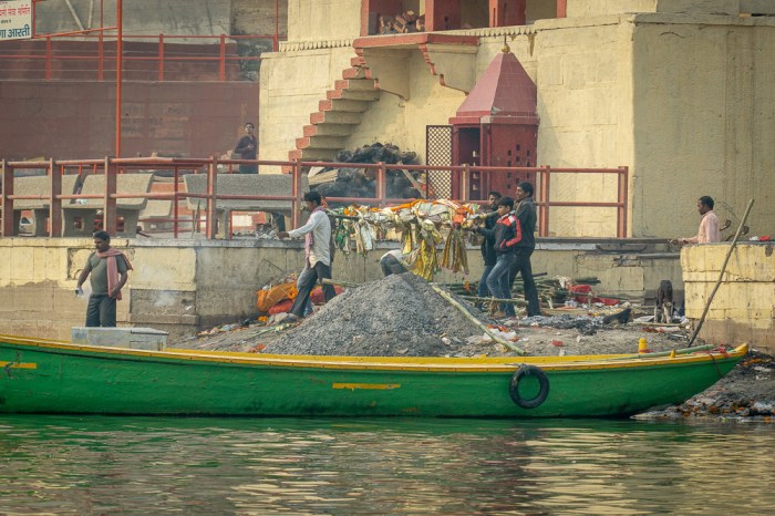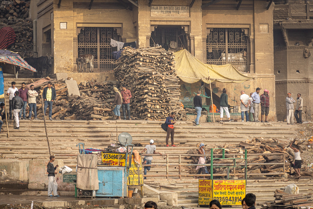 Im Laufe der Bootsfahrt nähern wir uns dem Manikarnika Ghat, einem der beiden Hauptverbrennungsplätze Varanasis, an dem täglich bis zu 50 Tote eingeäschert werden.