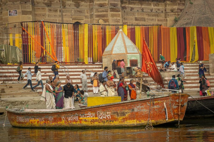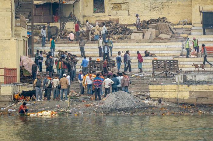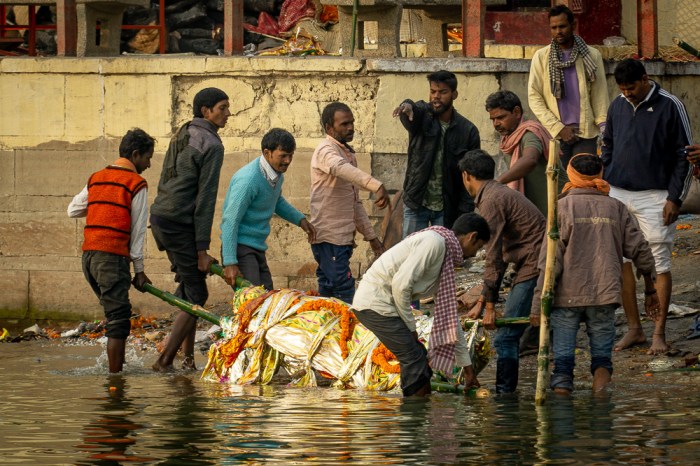 An den Bestattungen nehmen nur Männer teil. Die Frauen trauern zuhause. „No woman, no cry“? Genau deshalb. An der Farbe der Laken, die die Toten bedecken, erkennt man, ob es sich um eine Frau (golden) oder einen Mann (weiß) handelt. Bevor ein Leichnam auf den Scheiterhaufen gelegt wird, tauchen die Angehörigen ihn in den heiligen Ganges.