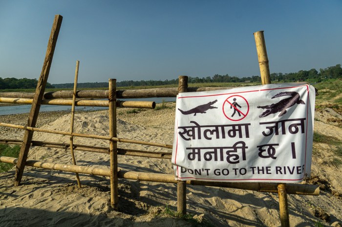 … Richtung Fluß. Eine Horde kleiner Jungs tobt am und im Wasser. Keine 200 Meter weiter chillt ein Krokodil am Ufer. Doch Panik ist in dem Fall fehl am Platz. Handelt es sich hierbei doch „nur“ um einen Gavial, der sich mit seiner reusenartigen Schnauze lieber über den Fisch hermacht.