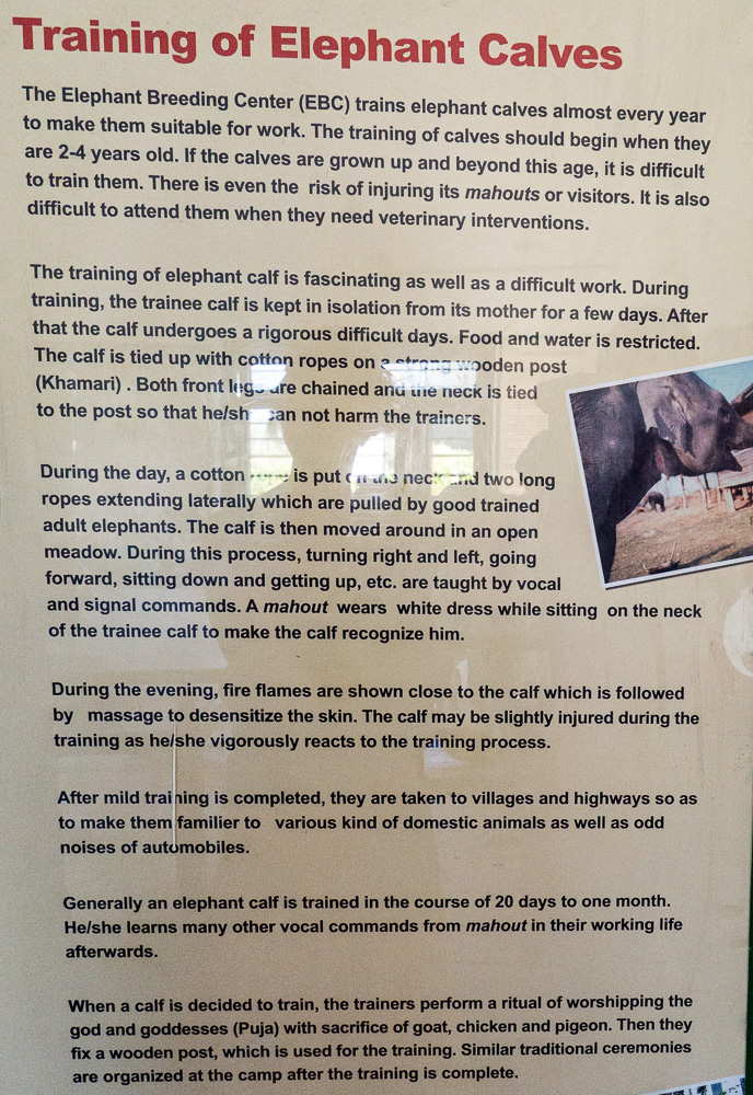 Selten habe ich, was Tiere anbetrifft, etwas so Deprimierendes gesehen. Die Kühe, die lediglich als Gebärmütter dienen, sind fast den ganzen Tag eng angekettet. Ein „wilder“ Elefantenbulle fungiert als Begatter. Die Babies werden den Müttern weggenommen und brutal abgerichtet. Und das alles im Namen der angeblichen Sicherheit für die Menschen, weil die ach so gefährlichen Tiere schon welche von unserer Spezies getötet haben.