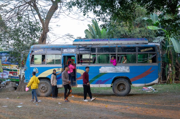Bevor wir zurück zum Hotel fahren, schauen wir noch kurz am an die Aufzuchtstation angrenzenden Gelände vorbei. Dort wird – ihr erinnert euch, es ist quasi Sonntag – fröhlich und ausgiebig gelacht, getanzt und gepicknickt (siehe heutiges Titelbild). Auch die farbenfrohen lokalen Busse fallen mir angenehm ins Auge.