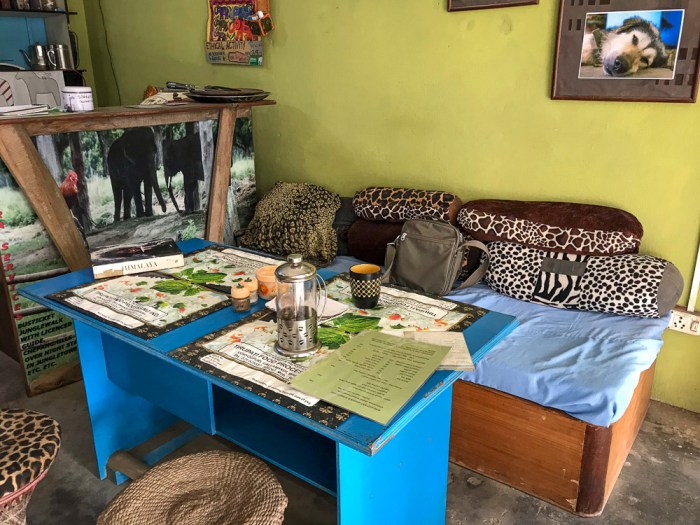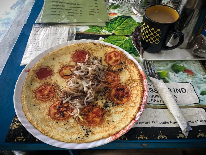 … und beschließe dann, dem grummelnden Magen nachzugeben. It’s lunch time! Nicht ganz zufällig lande ich im „Pancake House“, das mir gestern auf meiner ersten Erkundung durch den Ort bereits aufgefallen war. Es liegt ruhig und unscheinbar am Ende der kleineren der beiden Einkaufsstraßen des Ortes. Ich genieße den guten Bio-Kaffee und einen köstlichen Pfannkuchen mit Tomaten und karamellisierten Zwiebeln und komme dabei mit der netten Besitzerin ins Gespräch. Die schon etwas ältere Holländerin betreibt das kleine, schnuckelige Café seit zwei Jahren, ist jedoch bereits vor 12 Jahren im Anschluss an eine längere Reise hier „hängengeblieben“. Ehrenamtlich engagiert sie sich zudem für ein Projekt für Straßenhunde, für das ich gerne etwas spende.