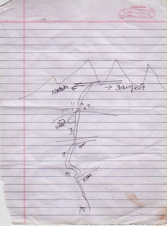 Und so spreche ich einen freundlichen Einheimischen an. Er erweist sich als Glücksgriff. Denn er begnügt sich nicht damit, mir irgendwie den Weg zu erklären. Nein! Er schnappt sich den Schulblock seiner Tochter und zeichnet für mich aus dem Kopf eine Karte, die alle relevanten Details enthält und mich problemlos den Weg mitten durch private Gärten und den anschließenden dichten Busch finden lässt.