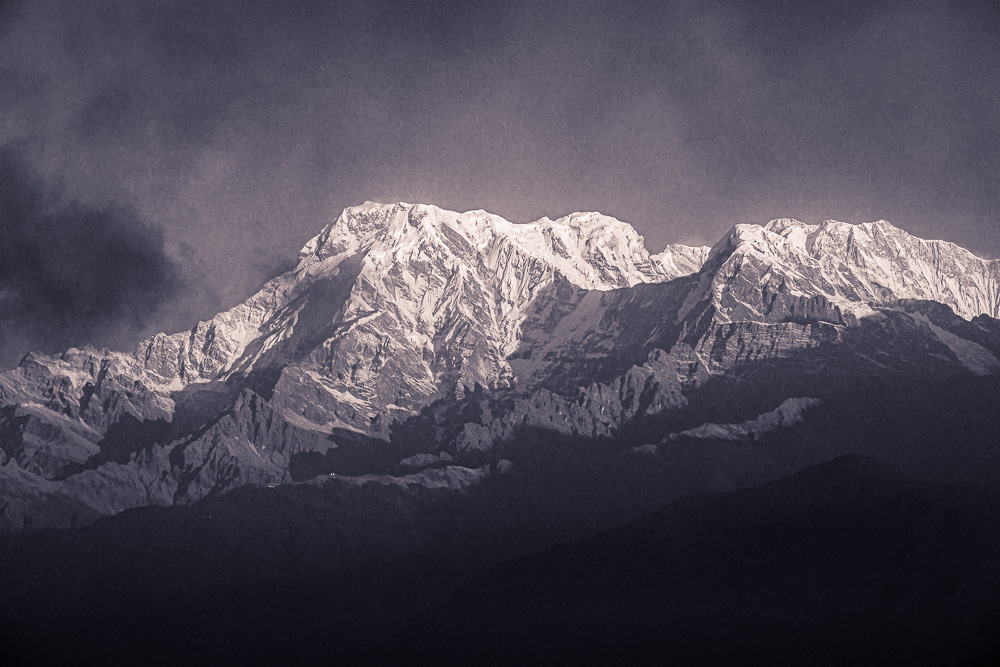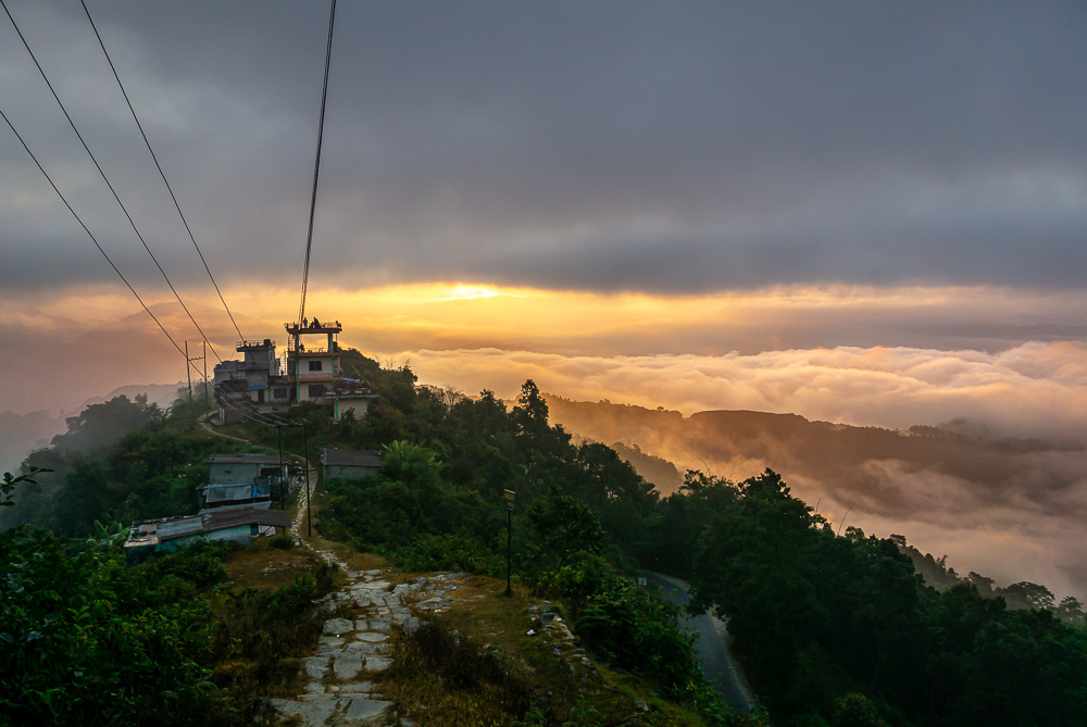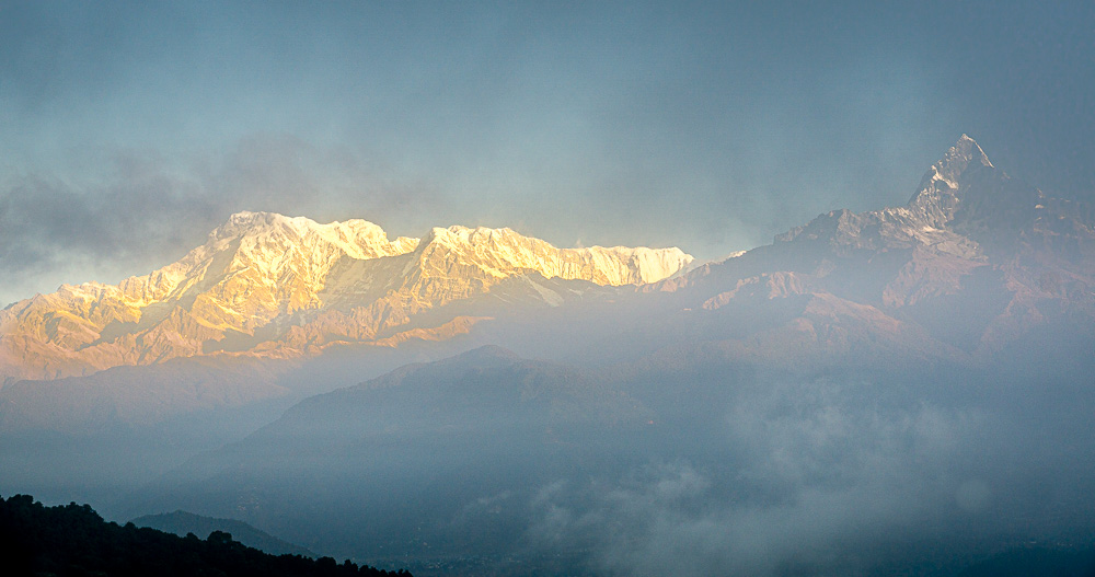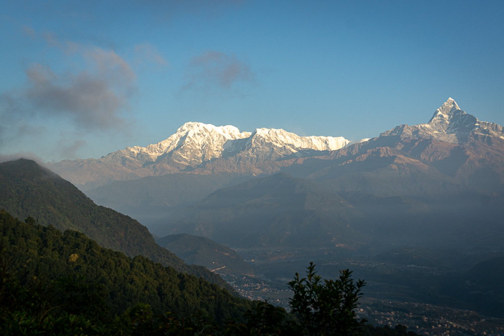 Um 5:30 Uhr sind wir bereit, dem frühmorgendlichen Spiel des Lichts mit den steinernen Giganten zu huldigen. Auf nach Sarangkot! Das kleine Bergdorf liegt auf rund 1.600 Metern Höhe und ist an sich nichts Außergewöhnliches. Die Aussichtsplattformen oben auf den Dächern der Anwohner jedoch verheißen den ultimativen Blick auf den Himalaya und das Tal, das wir soeben verlassen haben. Man kann von Pokhara aus alles Mögliche als Kür absolvieren oder auch lassen. Doch ein Besuch von Sarangkot zum Sonnenauf- oder -untergang ist absolute Pflicht!