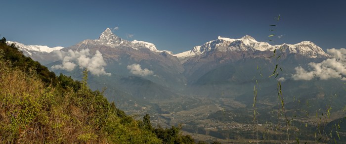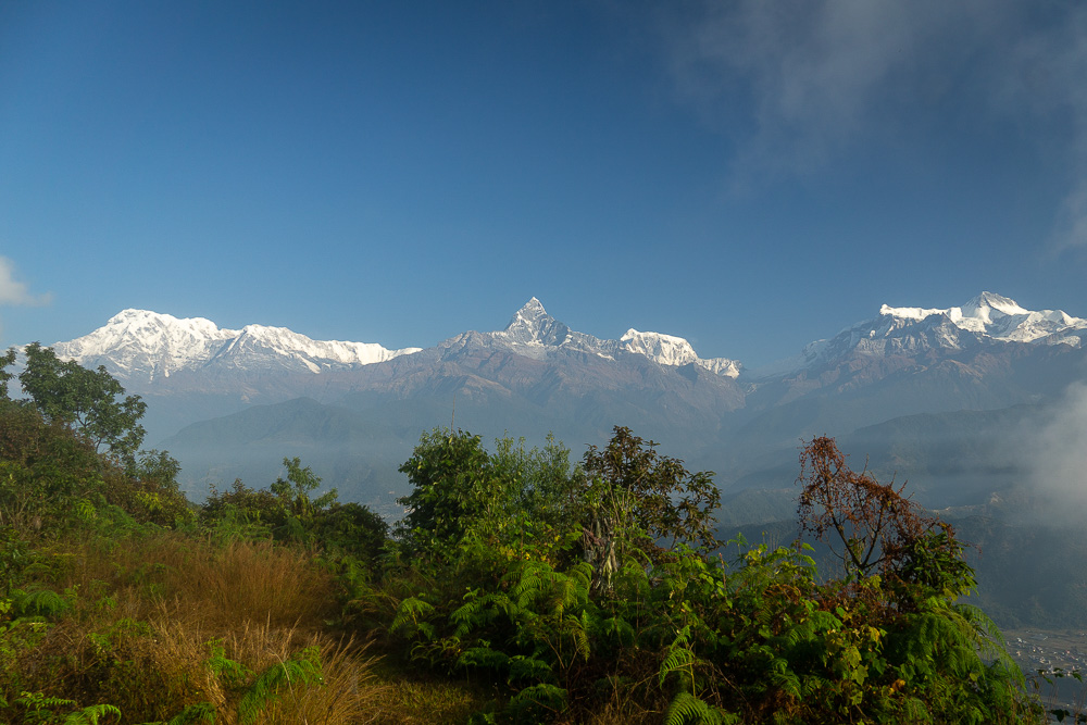 Und so schlage ich mich tapfer durch den Busch, reiße ein paar Löcher ins T-Shirt, werde – wie ich erst später am Nachmittag feststellen werde – von einem Blutegel angenagt und ausgesaugt, und stehe dann, etwas außer Puste nach einem ordentlichen Aufstieg, ganz alleine auf stiller, weiter Trek-Flur vor diesem Anblick. Den Himalaya scheinbar zu Füßen zu haben – natürlich haben die Berge 6.000 Höhenmeter Vorsprung -, ist wahrlich erhebend.