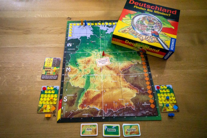 Fangen wir klein und nah an, nämlich im eigenen Land. Wo genau suche ich nach dem Watzmann? Wo zur Hölle könnte Siegen liegen? Und last but not least: „Finden Sie Minden?“ In diesem schon etwas betagten Brettspiel von 2007 geht es um Städte, Sehenswürdigkeiten und Gebiete bzw. Naturräume in Deutschland, die man möglichst genau auf der Karte lokalisieren soll.