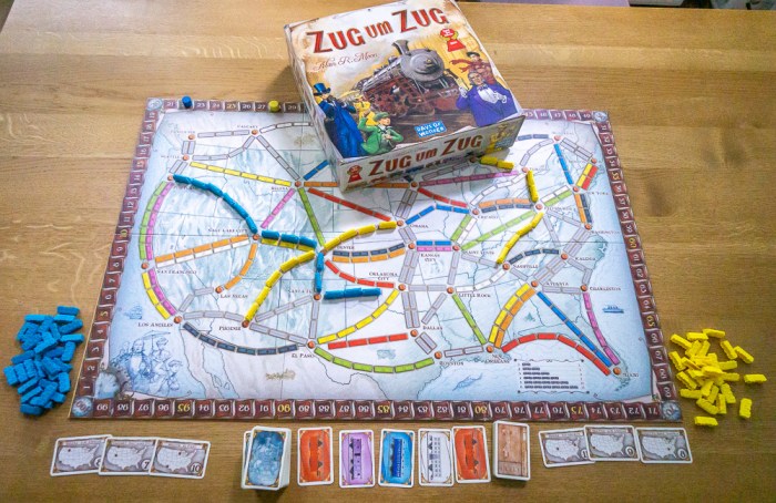 Bei „Zug um Zug“ geht es um abenteuerliche Reisen quer durch Nordamerika. Man muss Karten verschiedener Waggonarten sammeln und versuchen, verschiedene Städte auf dem bestmöglichen Weg miteinander zu verbinden. Das ist manchmal nicht so einfach, denn die lästigen Mitspieler kommen öfter in die Quere als einem lieb ist. Je länger die Route, desto mehr Punkte füllen das Konto. Und ganz wichtig: die vorgegebenen Strecken sollten möglichst vollständig bereist werden. Ihr wollt detaillierter wissen, was abgeht? Da steht’s.