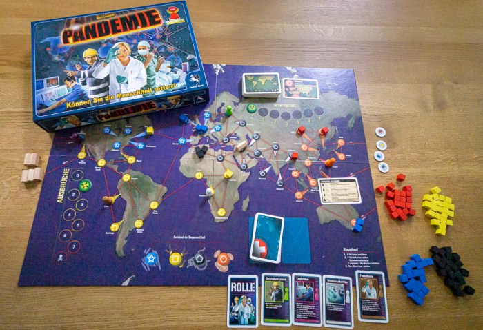 Bei „Pandemie“ spielt man nicht gegen-, sondern miteinander. Jeder bringt seine spezifischen Stärken und Fachkompetenzen ein. Zusammen sind wir ein hochkompetentes Seuchenbekämpfungsteam, das gleich vier tödliche Seuchen bekämpfen muss. Es liegt viel Arbeit vor uns, denn es gilt, um die ganze Welt zu reisen, Infektionsgefahren einzudämmen und die Grundlagen für die Erforschung der Gegenmittel zu legen. Dabei sitzt uns die Zeit arg im Nacken. Genau wie im echten Leben.