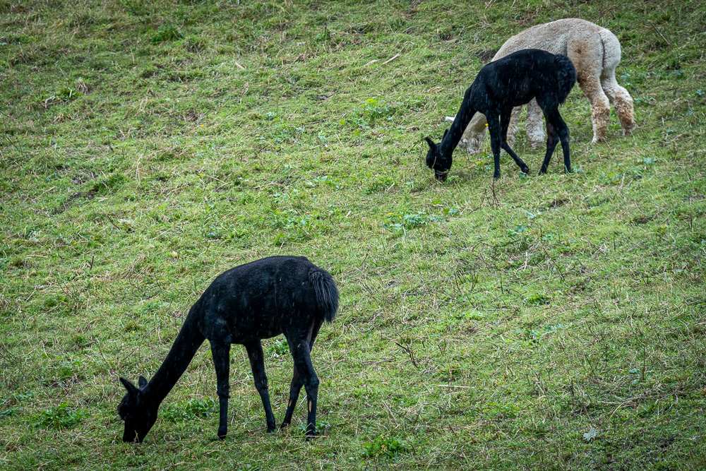 Nach einer ordentlichen Dosis Koffein drehen wir anschließend eine geriatrische Runde durch das Örtchen, immer entlang der Ache. Im Kurpark bewundern wir die stoisch dem Regen trotzenden Alpakas …