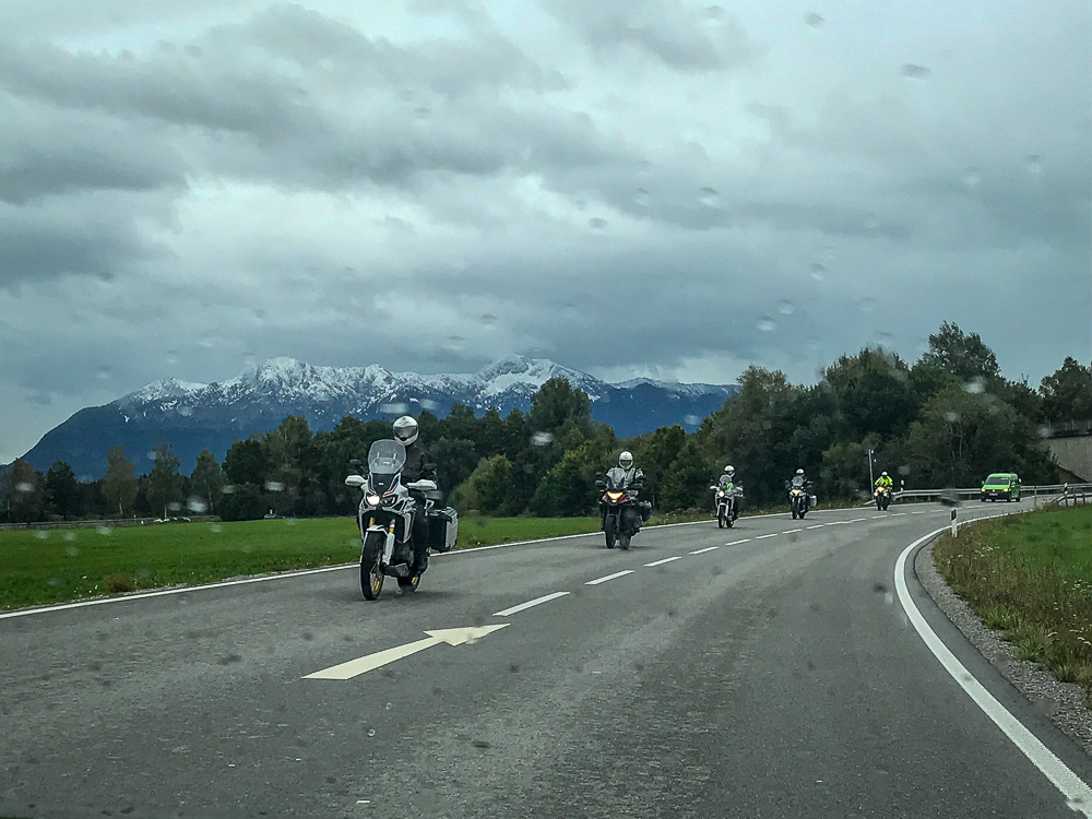 Als wir wegen eines dringenden Bedürfnisses den Parkplatz der Raststätte Hochfelln ansteuern, wird es auf schräge Art lustig. Dort ist eine Corona-Teststation aufgebaut, zu allen vier Seiten offen. Unter deren als Dach improvisierter Plastikplane werden die Dienst habenden Jungs und Mädels seitlich eingeregnet und frieren sich den Allerwertesten ab. Hinzu kommt offenbar Langeweile mangels passender Testkandidaten. Eine Handvoll Österreicher ist schnell „abgearbeitet“.