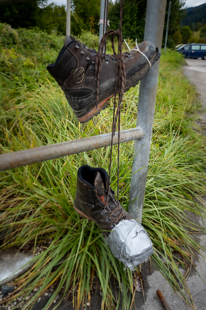 Eine Handvoll Besucher verliert sich in dem recht großen Gelände. Einsam und verlassen hängt ein Paar Wanderschuhe am Rande des Parkplatzes als stummes Zeugnis eines bewegungsintensiven Lebens.