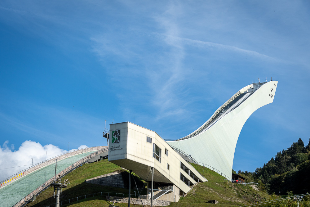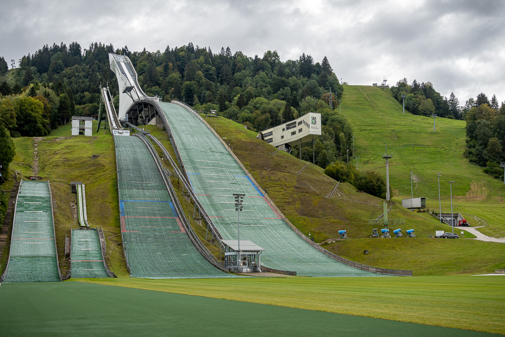 Heute führt uns unser erster Weg über die Hügel der Stadt zur Großen Olympiaschanze. Wenn das traditionelle Neujahrsspringen stattfindet, ist hier sicher die Hölle los. Doch an diesem 18 Grad warmen Spätsommertag Ende September herrscht naturgemäß gähnende Leere. Alles im grünen Bereich!