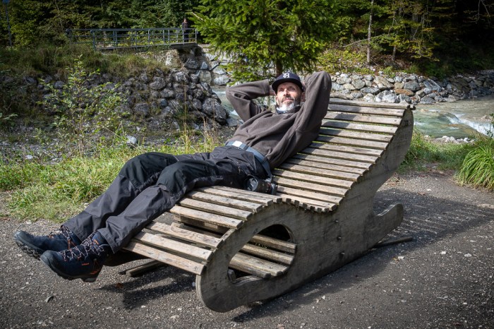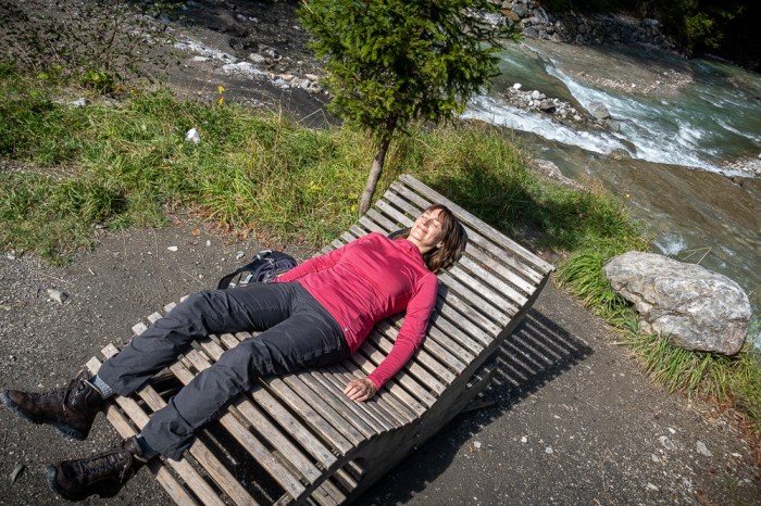 Als wir wenig später wieder das Tageslicht erblicken, erwarten uns pralle Sonne und ein schöner Rastplatz direkt am Wasser. Wir nutzen diese Steilvorlage und machen es uns ein Weilchen hier gemütlich, bevor es anstrengend wird. So lässt es sich aushalten!