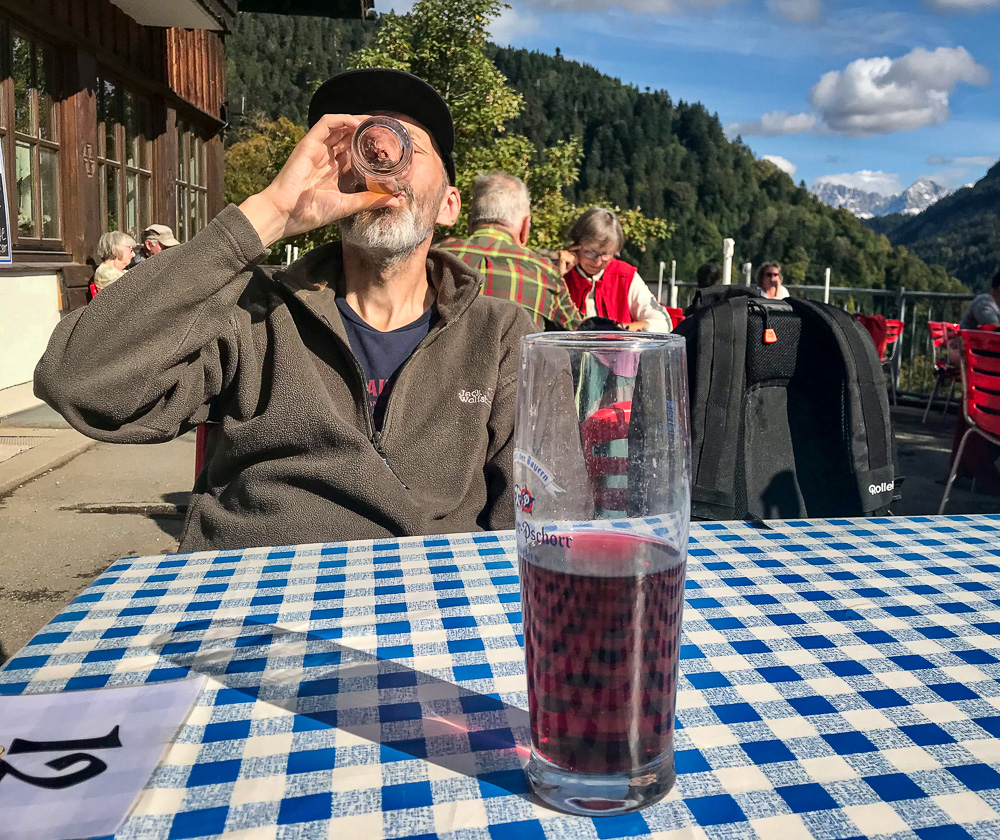 Anschließend starten wir den kleinen Aufstieg zur Partnachalm, die in 1.050 Metern Höhe liegt. Über einen steilen, aber schönen und gut beschaffenen Weg ist sie passabel zu erreichen. Die Aussichten, die sich von dort oben bieten, sind alle Mühen wert! Und den bisherigen Kalorienverbrauch gleichen wir dann auch umgehend mit Kuchen und Saft aus 😎.