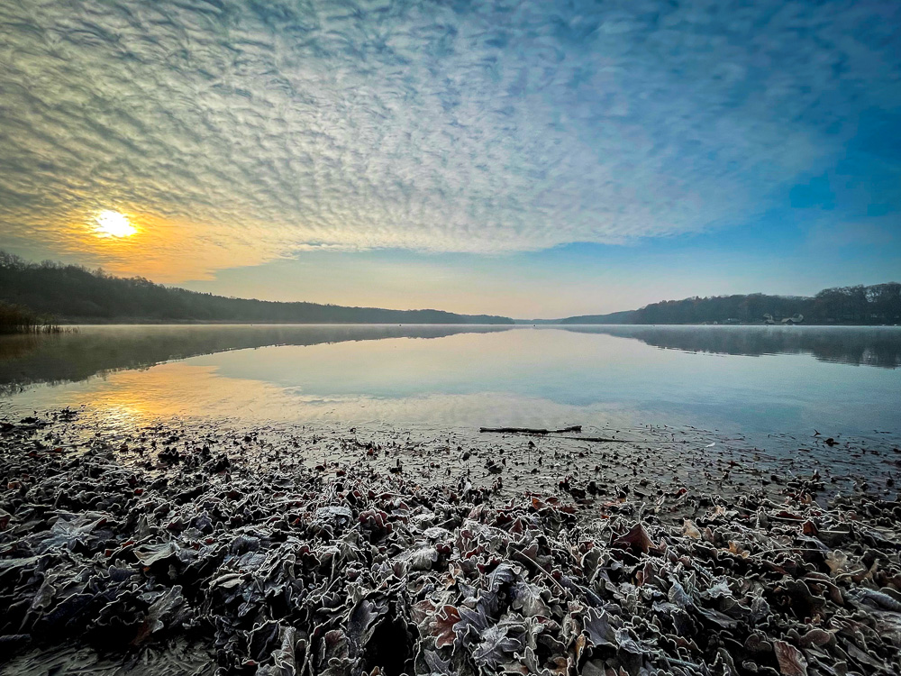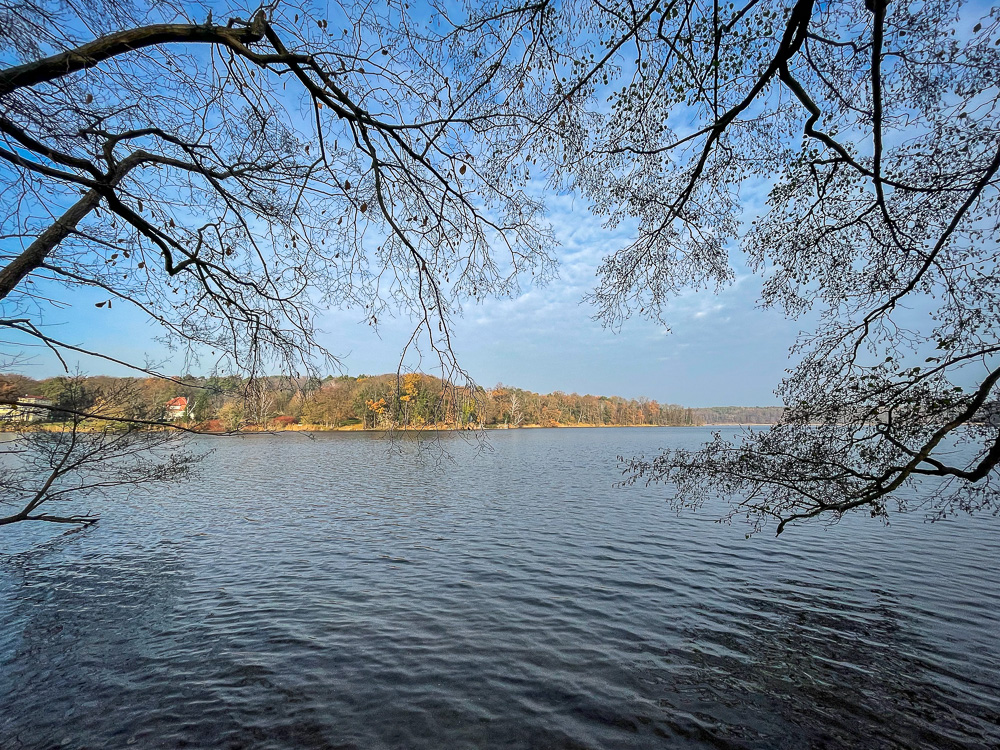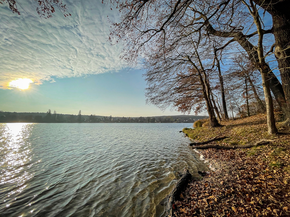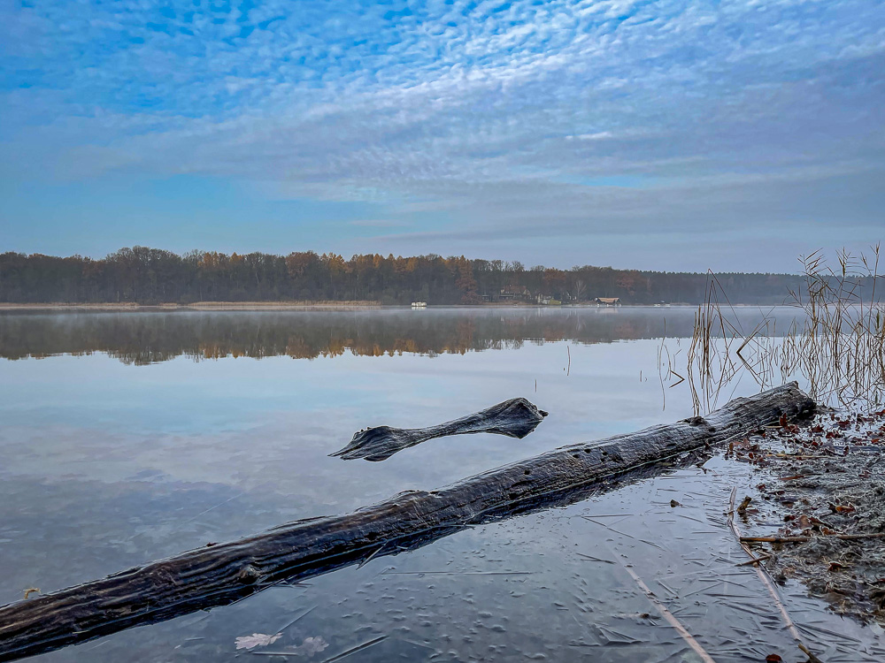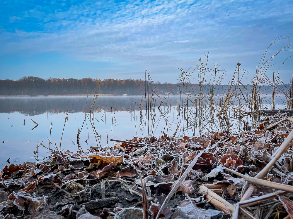 Die U-Bahnlinie 7 bringt mich bis zur Endstation am Rathaus Spandau. Dort nehme ich den Bus bis zum Potsdamer Ortsteil Groß-Glienicke. Von der dortigen Ortsmitte aus trennt mich nur noch ein Viertelstündchen Fußweg von dem kleinen Badestrand vor dem Restaurant Landleben. Das Café-Restaurant mit seiner schönen, großzügigen Terrasse ist virusbedingt verwaist. Doch wer braucht schon eine kulinarische Stärkung, wenn das Morgenlicht fast unwirklich schön über den Sacrower See und die dekorativ vom nächtlichen Frost angehauchten Blätter am Ufer huscht!