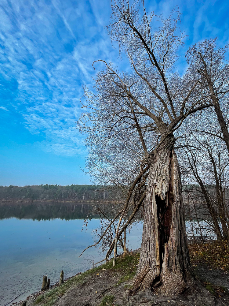 Kurz vor dem kleinen Örtchen Krampnitz biege ich rechts ab. Die letzten geschätzten vier bis fünf Kilometer führen mich durch den Königswald mit seinen imposanten Laubbäumen. Wenig später wundere ich mich über das schon recht spärlich gewordene Tageslicht. Wieso ist es denn so dunkel hier, wo doch das Laub bereits am Boden liegt und nicht mehr hoch oben in den Baumkronen als Sonnenschirm dient? Ein schneller Blick auf die Uhr klärt mich auf: der Nachmittag ist auf dem Weg in den Feierabend, bereit, der Dämmerung Platz zu machen. Nun aber flott! Denn ich habe wenig Lust, in einem mir unbekannten Waldgelände in die Dunkelheit hinein zu laufen, GoogleMaps hin oder her.