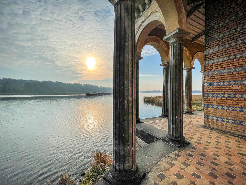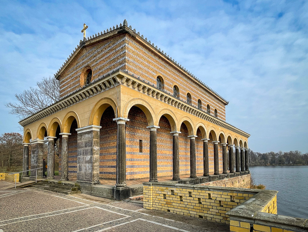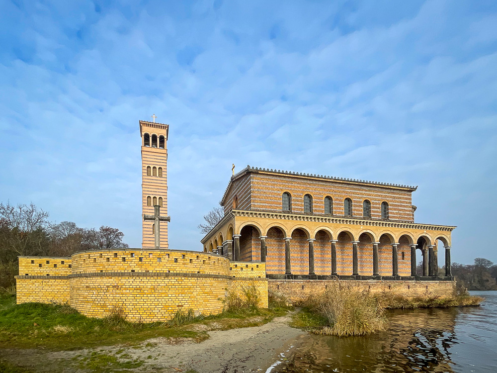 Gefühlt viel zu schnell ist die Ortschaft Sacrow erreicht, wo ich den gleichnamigen See nach einer halben Umrundung verlasse. Dort wartet im direkt am Wasser gelegenen Schlosspark das architektonische Highlight der Tour auf mich: die Heilandskirche. Wegen ihrer ungewöhnlichen Bauweise, ihres südländischen Flairs und nicht zuletzt der sehr fotogenen Premium-Lage direkt am Ufer der Havel gilt sie als wahres Schmuckstück unter den Kirchen. Hier finden nicht nur Gottesdienste und Trauungen statt. Sie ist auch als stimmungsvoller Ort für Konzerte bekannt, beliebt und begehrt.