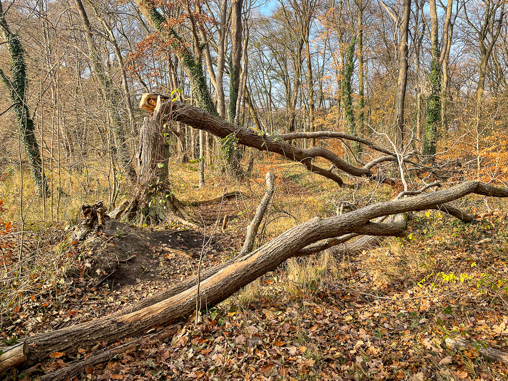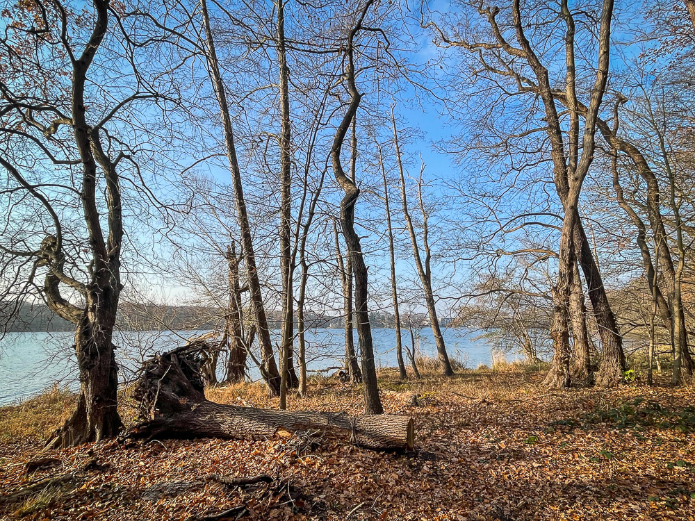 … bis irgendwann eine scharfe Rechtskurve in Richtung Königswall – eine der ältesten Wehranlagen Europas – kommt. Dort geht es ein kurzes, steiles Stück den Hügel hinauf. Oben angekommen, schlage ich eine – hüstel – alternative Route ein und irre ein wenig in der Botanik herum. Da sich partout kein „ordentlicher“ Weg bergab zurück zum Seeufer finden lässt, fräse ich mich eben querfeldein und „offroad“ über allerlei Hindernisse nach unten.