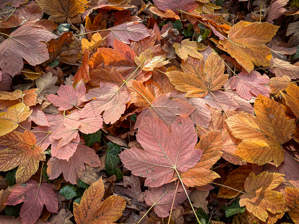 Nachdem ich mich sattgesehen habe – was ein Weilchen dauert -, biege ich nach links auf den Uferweg ein. Dieser führt mich auf leicht hügeligem, durch den Laubfall gut gepolsterten Weg durch einen schönen Mischwald …