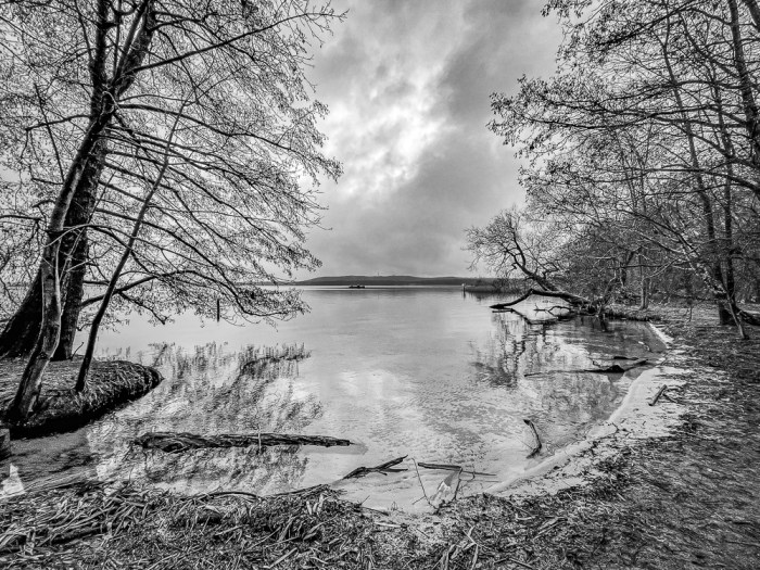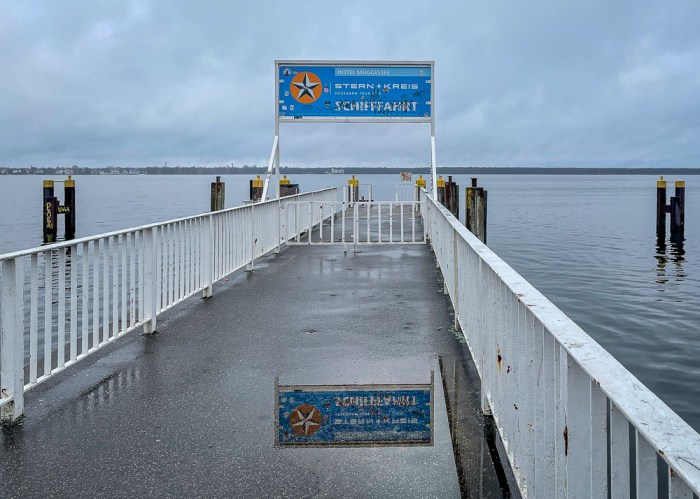 … laufe ich hinunter zum Ufer des Müggelsees – nicht ohne einen sehnsüchtigen Blick ins zur Zeit geschlossene Café Mauna Kea zu werfen, wo mir bei meinem letzten Besuch hier ein wunderbar exotisches Frühstück kredenzt wurde. Am See angekommen, flaniere ich kurz an der überschaubaren Promenade entlang, an der im Sommer stets das pralle Leben tobt. Heute jedoch finde ich die Schiffsanlegestelle verwaist und verlassen vor. Hier und da eine Mutter, ein Vater, die/der dem Bewegungsdrang des Nachwuchses ein Ventil verschafft. Zwei ältere Herrschaften. Und ich.