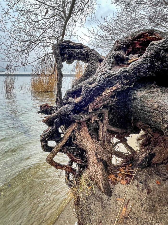 Nun aber los! Wenn man zu lange herumsteht, wird es schnell ungemütlich bei dem nasskalten Wetter. Schneeregen war angekündigt, doch der Schnee fällt aus. Bleibt ein zarter Nieselregen. Das tut meinem Vergnügen am Wandern jedoch keinen Abbruch. Was ich allerdings etwas schade finde: die Strecke bis Müggelheim ist in weiten Teilen (geschätzte 60 bis 70%) asphaltiert. Das hatte ich so nicht in Erinnerung. Ich laufe auf meinen Touren ja lieber auf natürlichem Untergrund. Denn Asphalt habe ich im Alltag in der Stadt schon genug unter den Füßen. Doch das bleibt der einzige Wermutstropfen heute. Lasst uns lieber einen ersten Blick auf die winterlich karge Landschaft werfen!