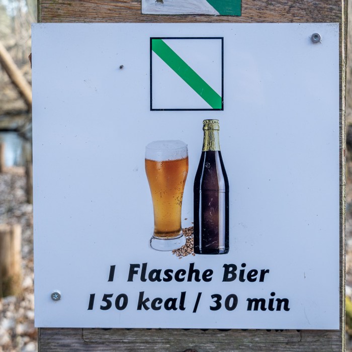 … bevor ich weiter meiner Wege wandere, nun immer unten im Tal. In der Nähe des Gasthauses Pritzhagener Mühle stoße ich auf einen ausgeschilderten Wanderweg der ganz besonderen Art: die Kalorienpromenade! Der rund 11 Kilometer lange Rundweg motiviert die tapferen Wanderer in regelmäßigen Abständen mit Tafeln, auf denen anschaulich dargestellt ist, wieviele Kalorien man auf einem bestimmten Abschnitt in etwa verbraucht hat. So lässt sich eine solche Strecke doch locker absolvieren! Oder aber über die eine oder andere Diät nachdenken 😅.