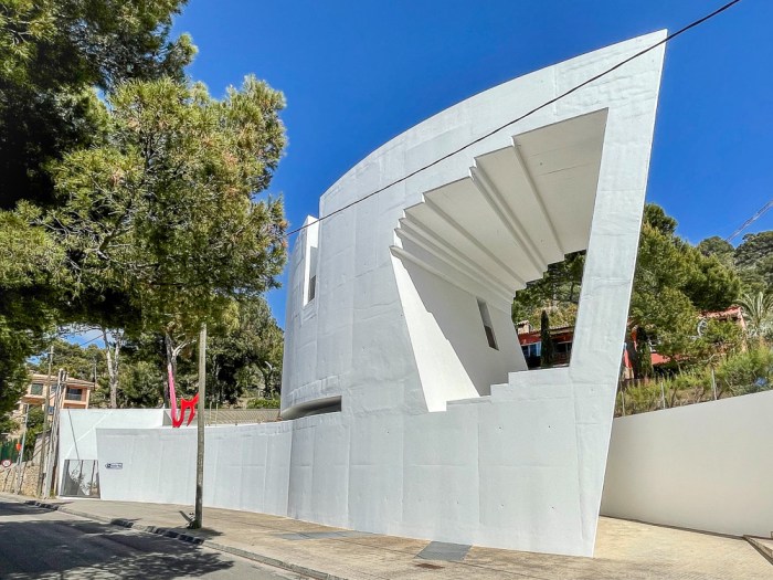 Am Ende der Promenade biege ich nach links ab und nähere mich dem eigentlichen Begehr, weswegen es mich nach Port d’Andratx verschlagen hat. Das futuristische Gebäude des Studio Weil ist mit seinen ungewöhnlichen Schrägen und Rundungen ein architektonischer Hingucker. Kein Geringerer als Stararchitekt Daniel Libeskind hat es für die 2018 verstorbene Malerin und Bildhauerin Barbara Weil gebaut. Schade, dass man es zumindest momentan innen nicht besichtigen kann. Doch auch der Blick auf das Äußere lohnt sich.
