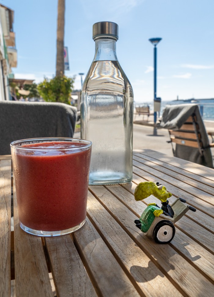 Zurück zur nahen Promenade. Eine Erfrischung muss her! Mein grüner Begleiter und ich laben uns im Schatten einer kleinen Bar an einem leckeren Frucht-Smoothie …