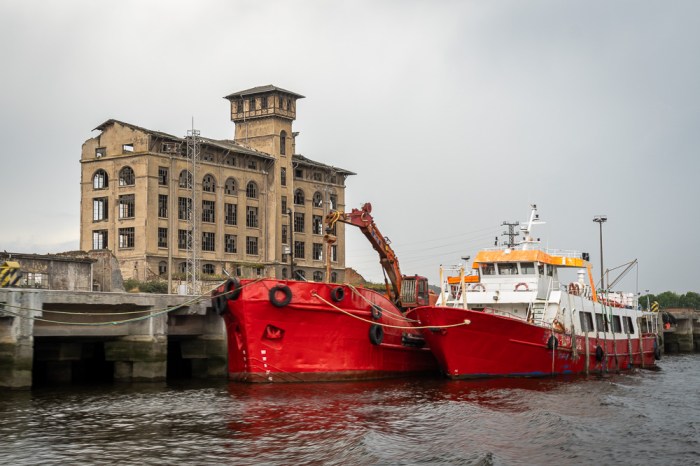 Nach dem Aufwachen am späteren Nachmittag raffe ich mich wieder auf und schlendere am Ufer entlang. Dann buche ich spontan ein Ticket für die einstündige Bootstour, die mich stadtauswärts bis hin zu den alten Industrieanlagen im Hafen bringen wird. Was das Wetter betrifft, so bin ich zu dem Zeitpunkt noch optimistisch.