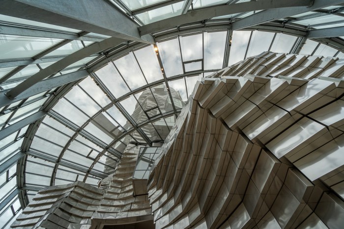 Voller Vorfreude eile ich hin und verdränge dabei den eigentlich unausweichlichen Gedanken, dass ich eines der Highlights, nämlich die Dachterrasse im 9. Stock heute buchstäblich in den Wind schießen kann. Und so trifft es mich dann schon halbwegs unvorbereitet, dass die geniale Freiluft-Aussicht bei einer Windgeschwindigkeit von 45 km/h heute ausfällt. Man kann zwar auch im 8. Stock schöne Aussichten auf das Panorama der Stadt genießen. Aber durch die – ziemlich schmutzigen – Scheiben lässt es sich eben nicht sonderlich gut fotografieren. Egal. Denn alles andere ist toll! Fangen wir bei der Architektur an:
